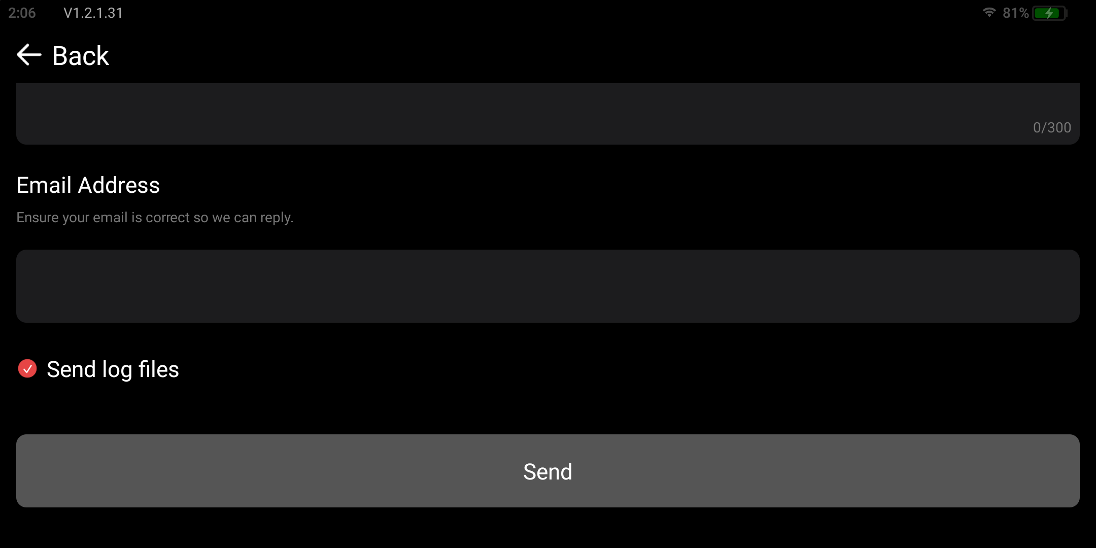 Swipe down the screen, ensure the MIRACO is connected to the internet, open "Settings," scroll down to find "Feedback," enter your email address, check the box for "Send log files," and click "Send."