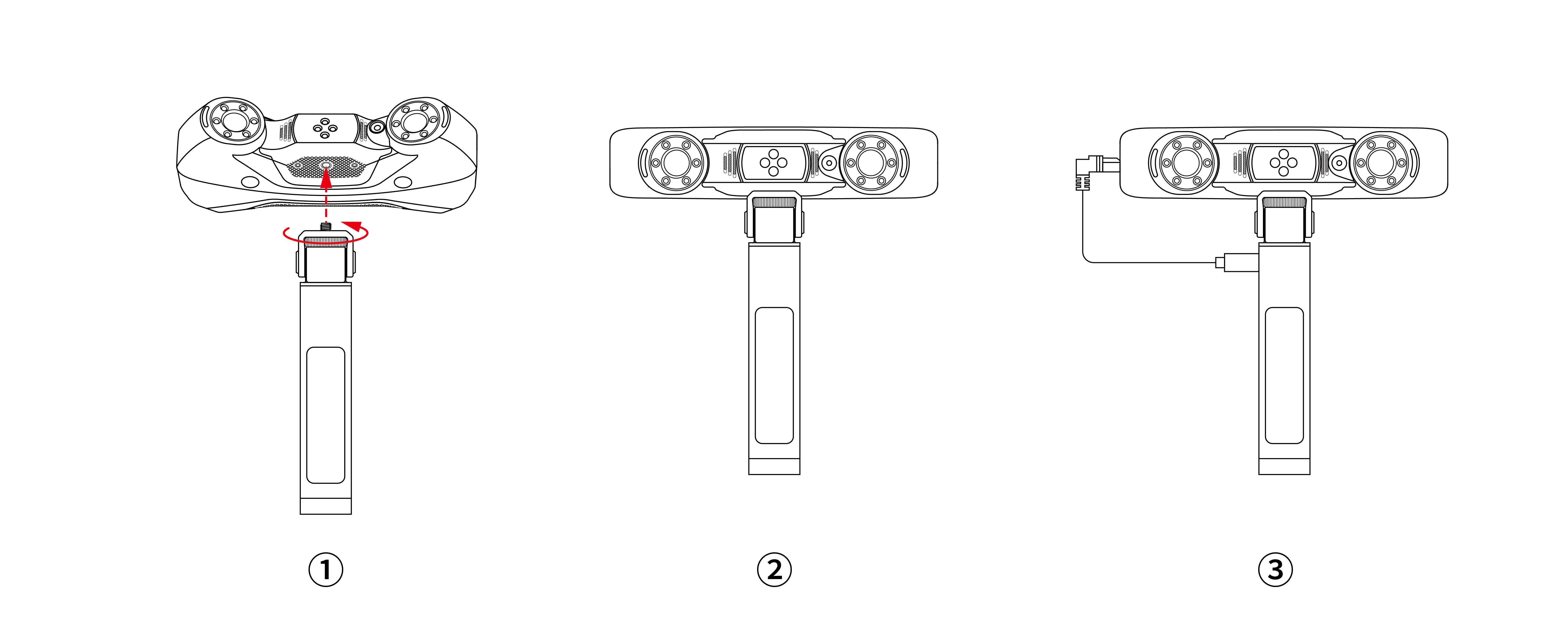 1. Follow steps ① and ② to align the screw on the battery grip with the threaded hole on the scanner's side, then turn the wheel to secure it.