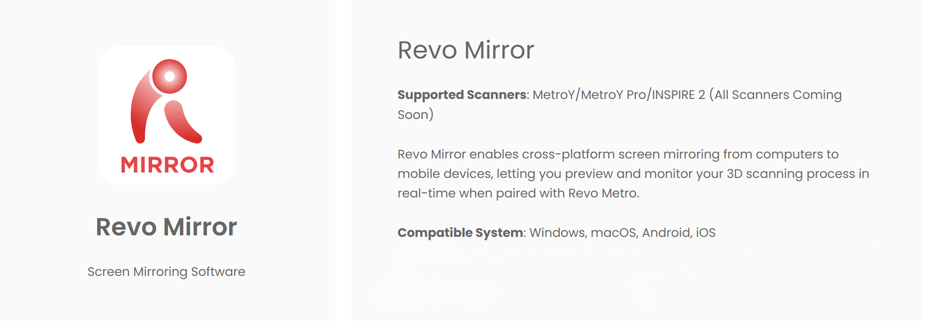 If you need to use the Wireless Screen Mirroring function, first visit the Support-Download page on the Revopoint official website. There, download the "Revo Mirror" software for both the PC version and the Mobile version.