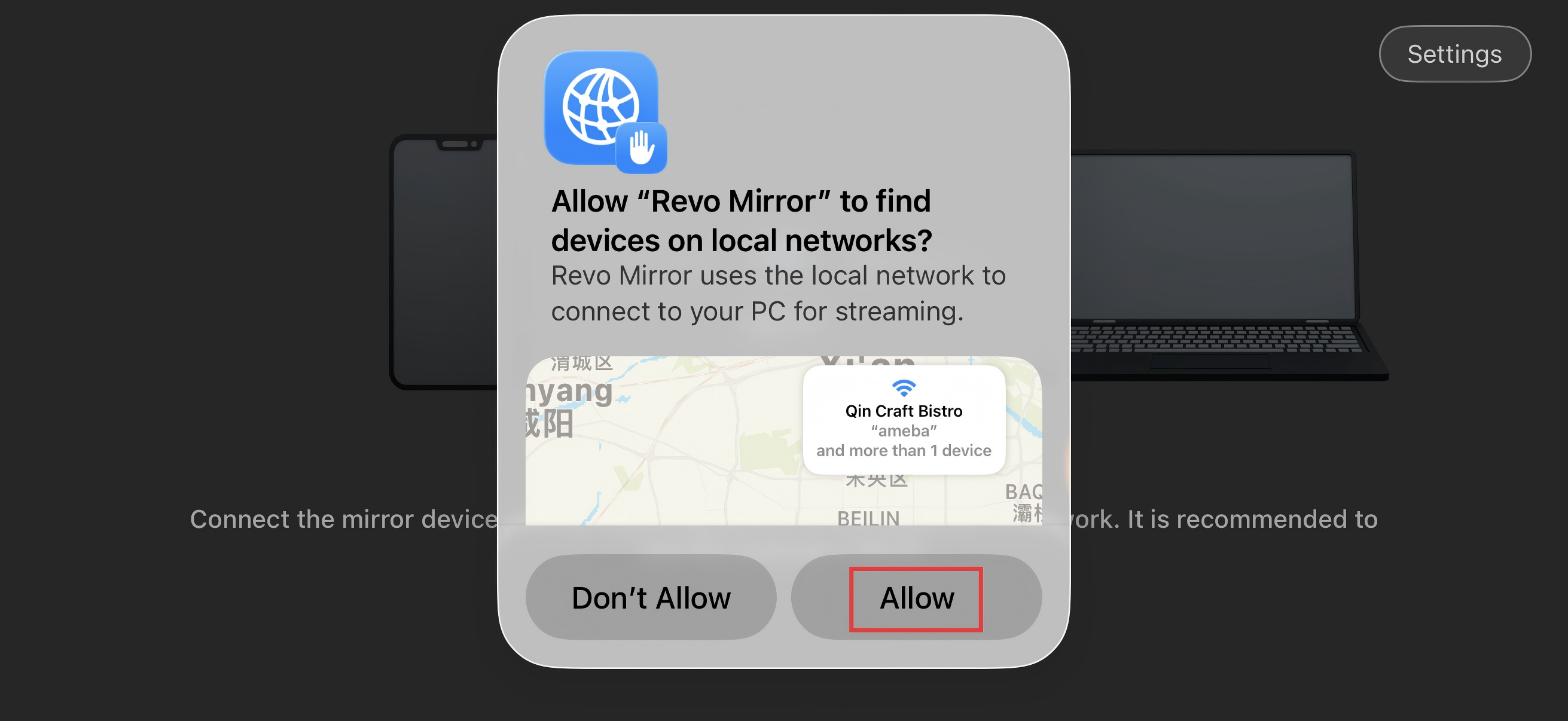 Note: For first-time download and use of the app on iOS mobile devices, tap “Allow” to let “Revo Mirror” find devices on the local network.
