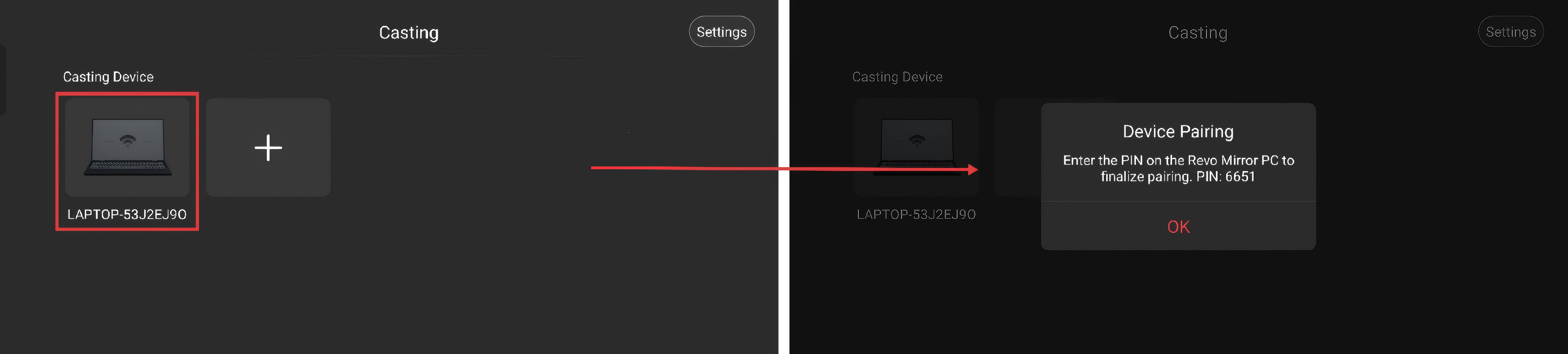 Note: The PIN code is only required during the initial pairing. After successful pairing, simply ensure that the computer and mobile device are on the same network, then tap the paired device in the Revo Mirror device list on the mobile app to start screen mirroring directly.