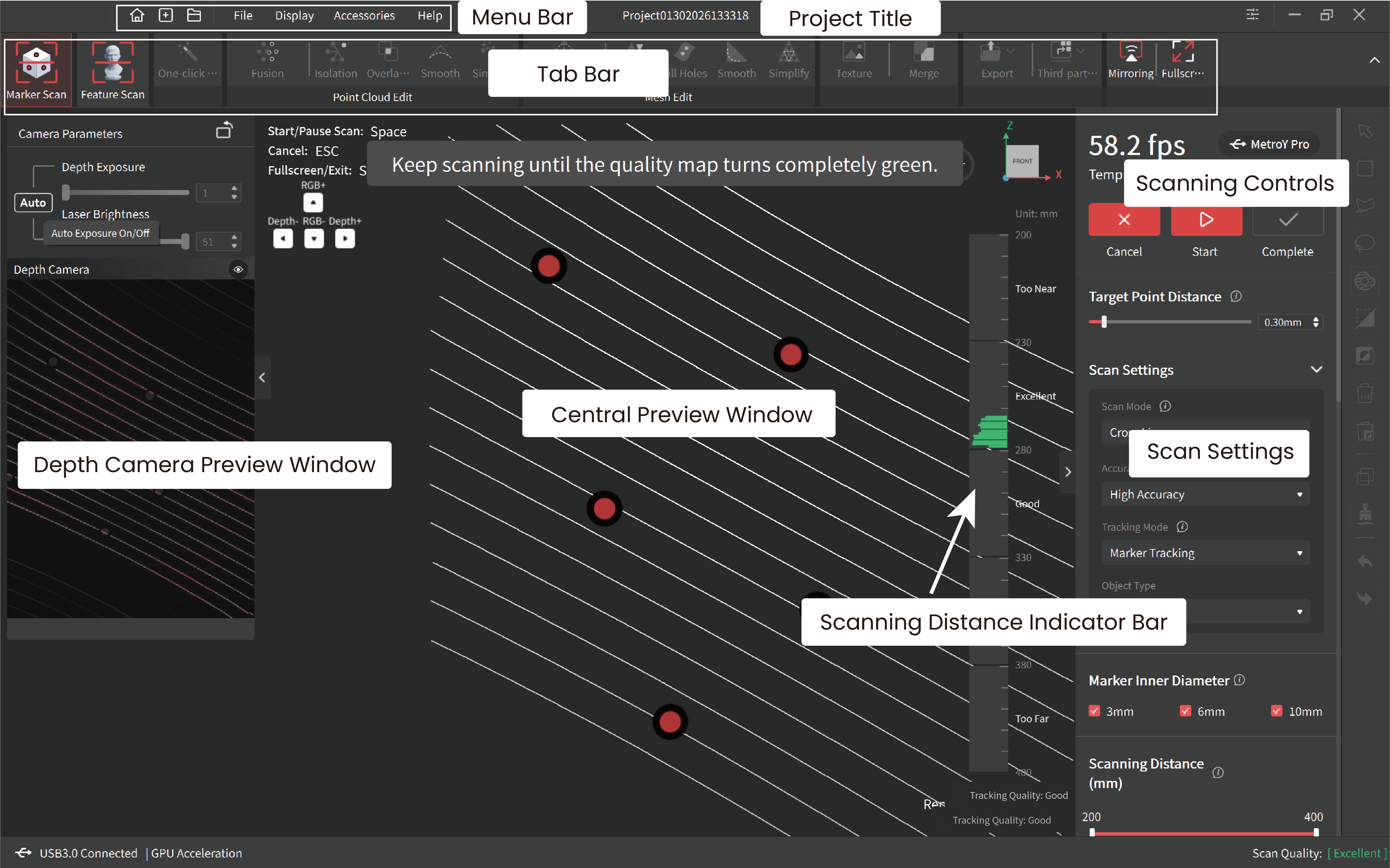 * Global Marker Tracking can provide more accurate scanning results and smoother frame stitching. There are two steps: first, scan the markers to create global marker coordinates, and then scan the object based on these coordinates.