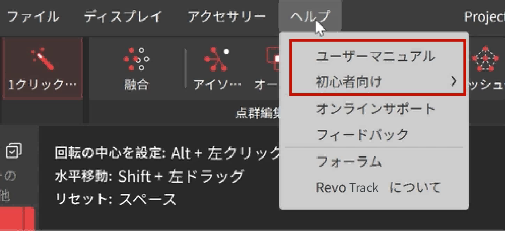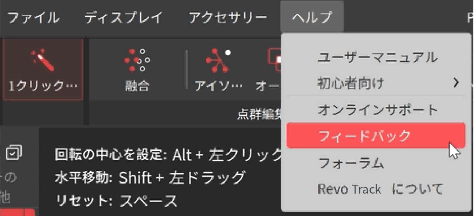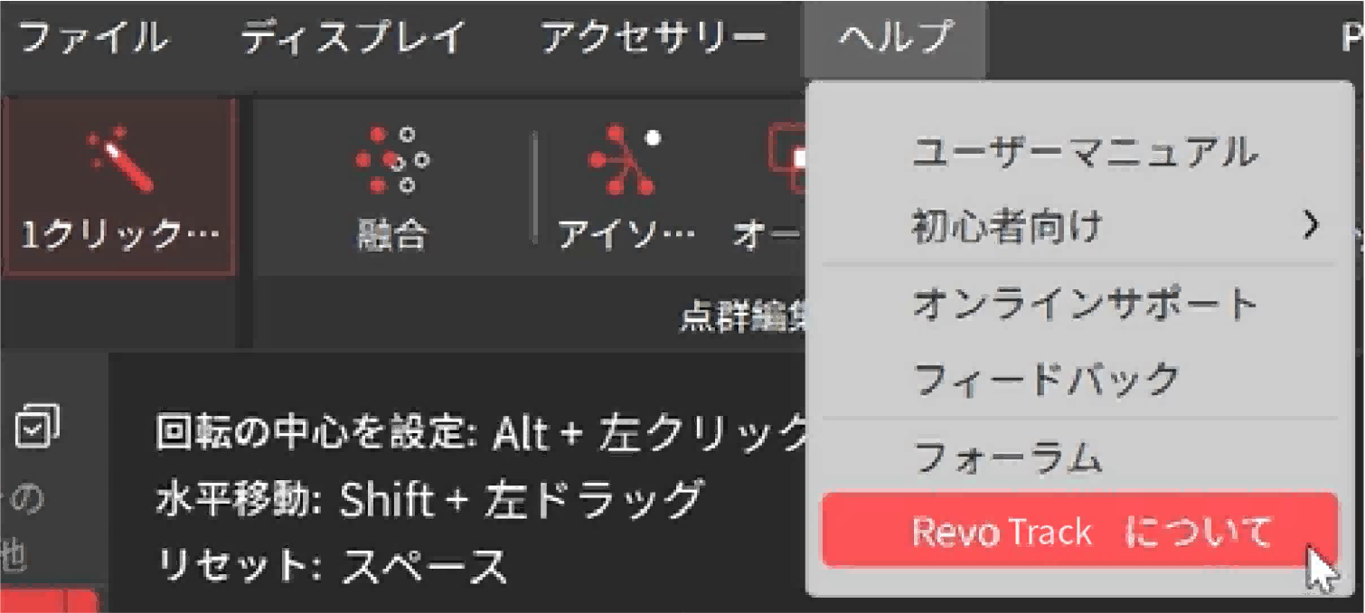 Revo Trackit にアップデートがある場合、起動時に通知ポップアップが表示されます。表示される指示に従って、ソフトウェアを更新してください。また、メニューバーから[ヘルプ]>[Revo Track について]を選択することで、最新バージョンの確認やアップデートを行うことも可能です。 |