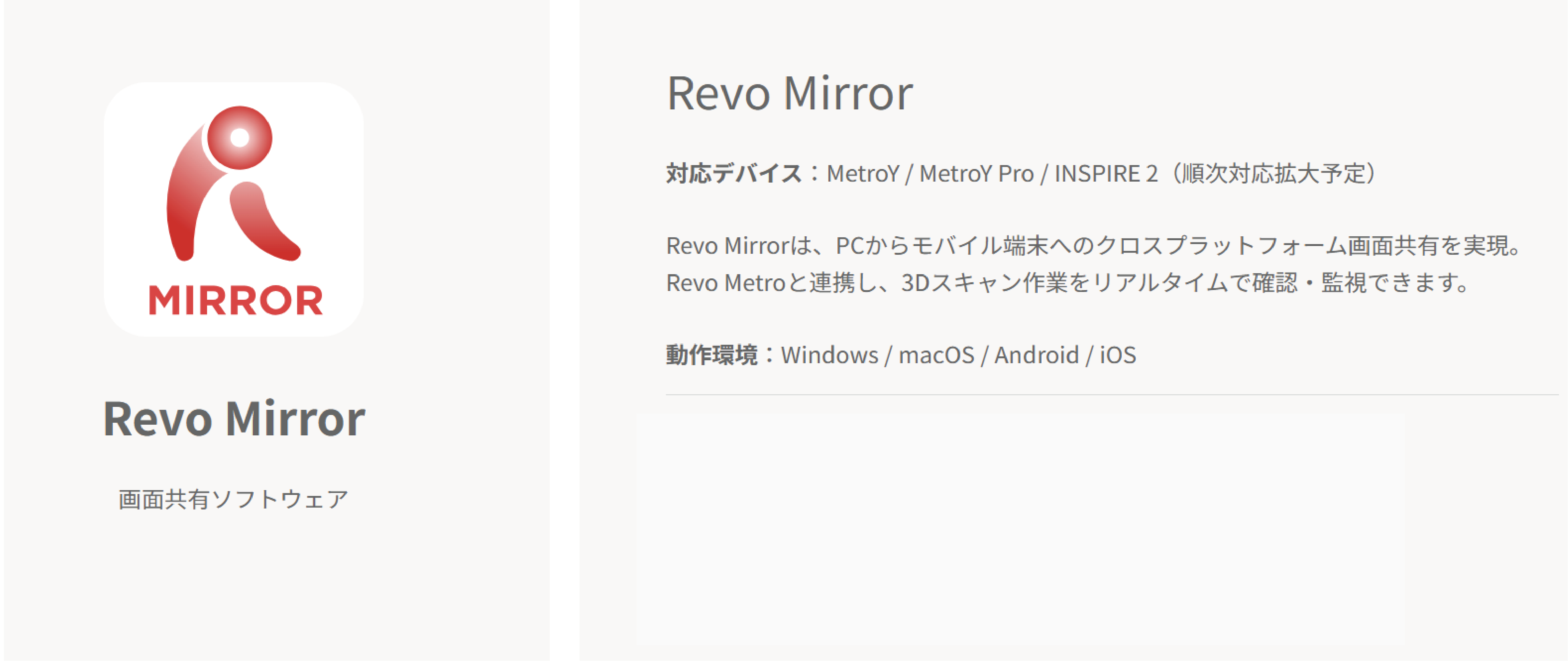 ミラーリング機能を使用する場合、公式サイトの「サポート - ダウンロード」から PC 版・スマートフォン版の Revo Mirror をダウンロードしてインストールします。