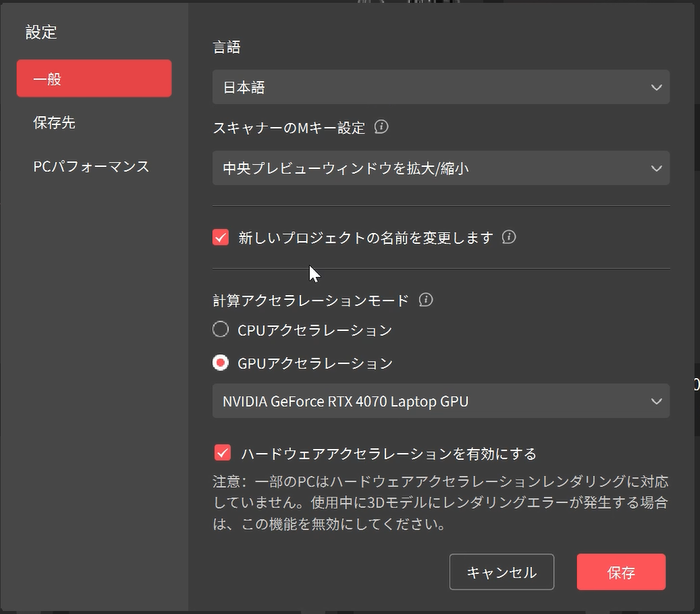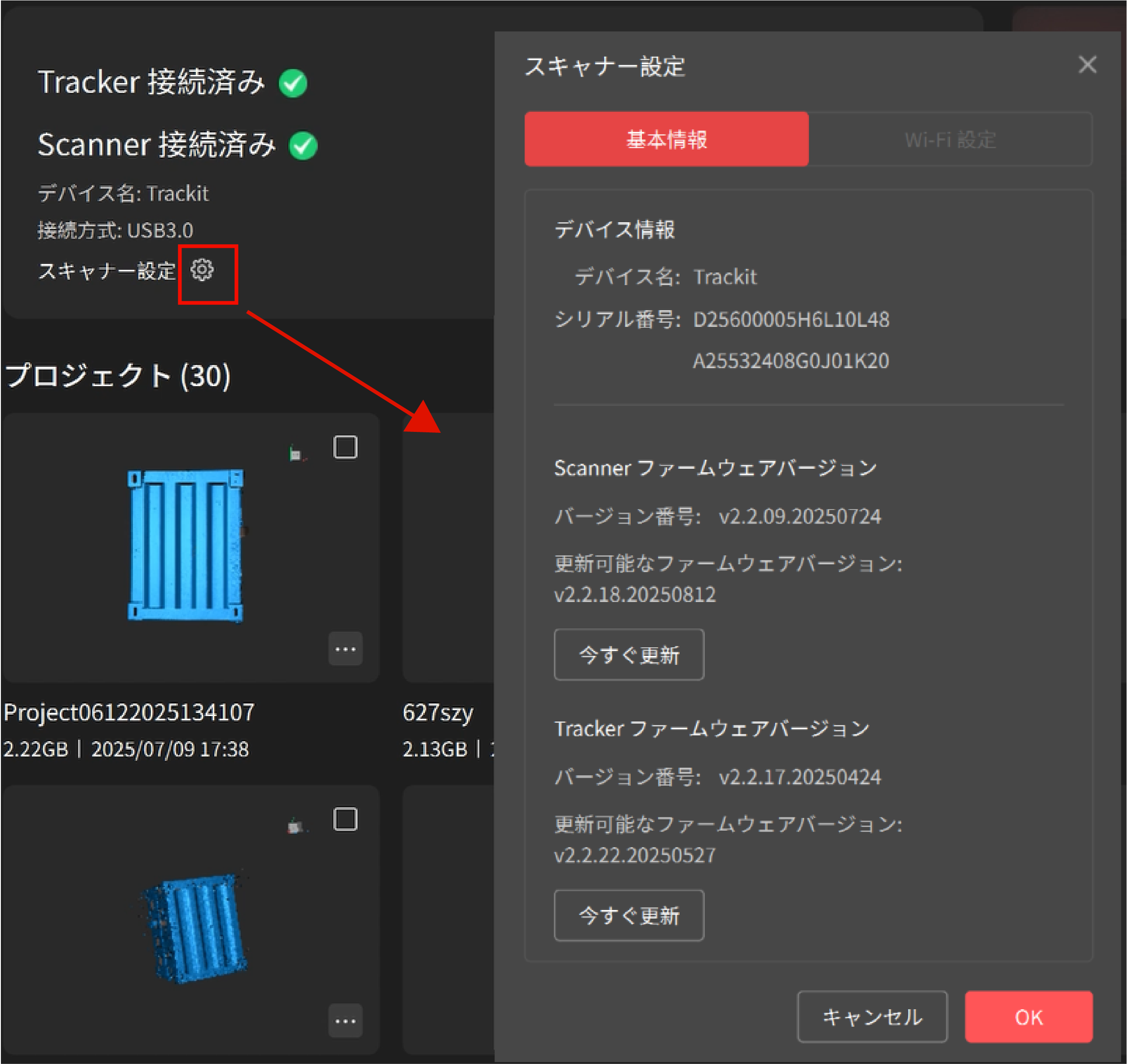設定アイコンをクリックすると、スキャナーの設定画面にアクセスできます。 この画面では、デバイスのシリアル番号(SN)情報を確認できます。また、ScannerおよびTrackerのファームウェアバージョンも表示されます。 新しいファームウェアバージョンが利用可能な場合は、「今すぐ更新」ボタンが表示されます。「今すぐ更新」ボタンをクリックすると、ファームウェアのアップデートが開始されます。 |