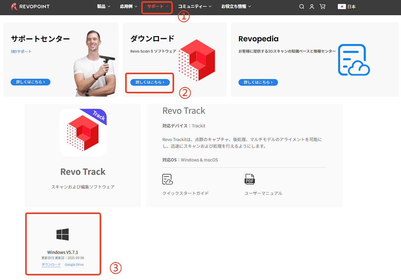 初めてスキャンを行う前に、Revopointウェブサイトのサポート-ダウンロードにて、Trackit3Dスキャナー用のRevo Trackソフトウェアをダウンロードしてください。