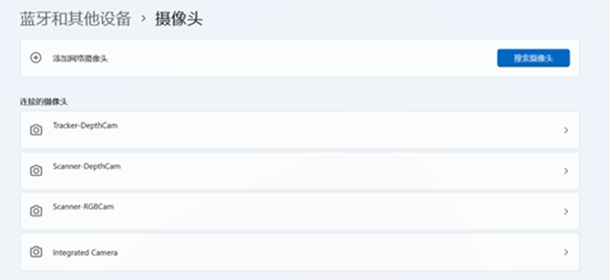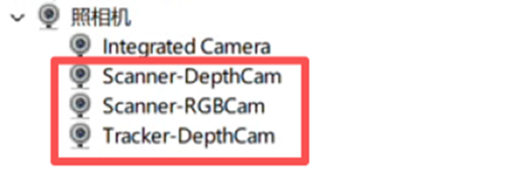 其次打开摄像头设备设置-确保已连接Scanner-DepthCam, Scanner-RGBCam, Tracker-DepthCam 3个摄像头(不同设备数量不一样,上述Trackit设备为3种,常规扫描仪为DepthCam和RGBCam两种,若设备无彩色扫描功能,则只有DepthCam一种)。