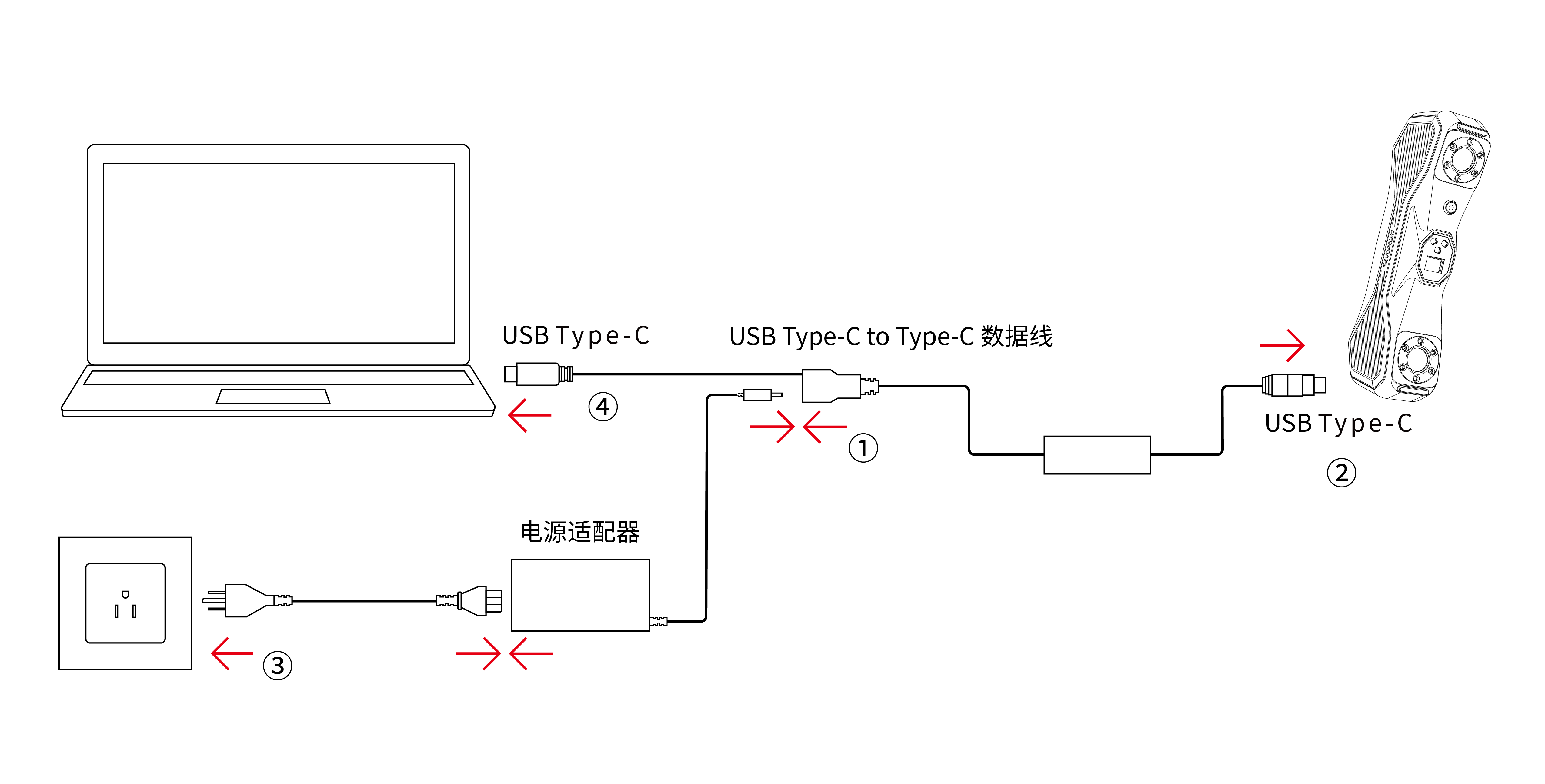 建议按图示①到④的顺序,将扫描仪依次连接至电源和电脑USB3.0Type-C接口。