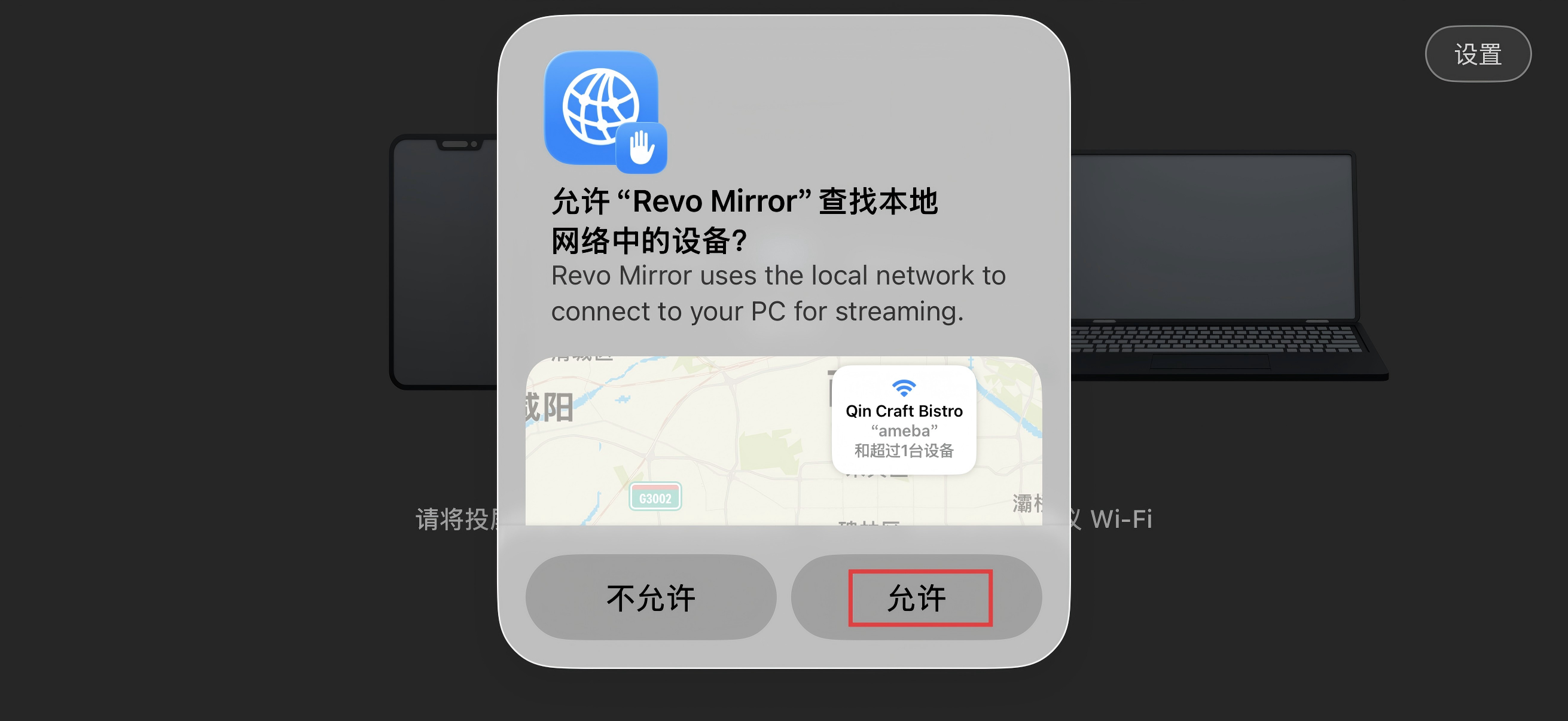 注:iOS移动端首次下载使用APP,需点击允许“Revo Mirror”查找本地网络中的设备。
