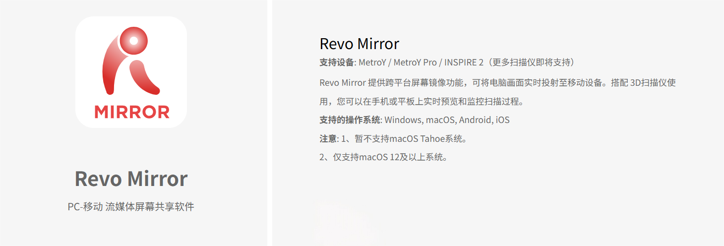 若需使用无线投屏功能,请先前往Revopoint官网服务与支持-下载中心 页面下载“Revo Mirror” PC端及手机端软件。