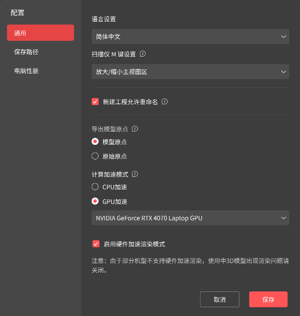 在扫描过程中,按住 Scanner 上的 M 键可进入快捷菜单实现功能切换。 模型原点:以扫描物体包围盒前表面的中心为坐标原点。 原始原点:以扫描仪极线校正后的左相机为坐标系原点或导入全局标记点所在的坐标系原点。 注: GPU 加速仅支持 Windows 上 NVIDIA GeForce RTX 30系列和40系列的 GPU。 |