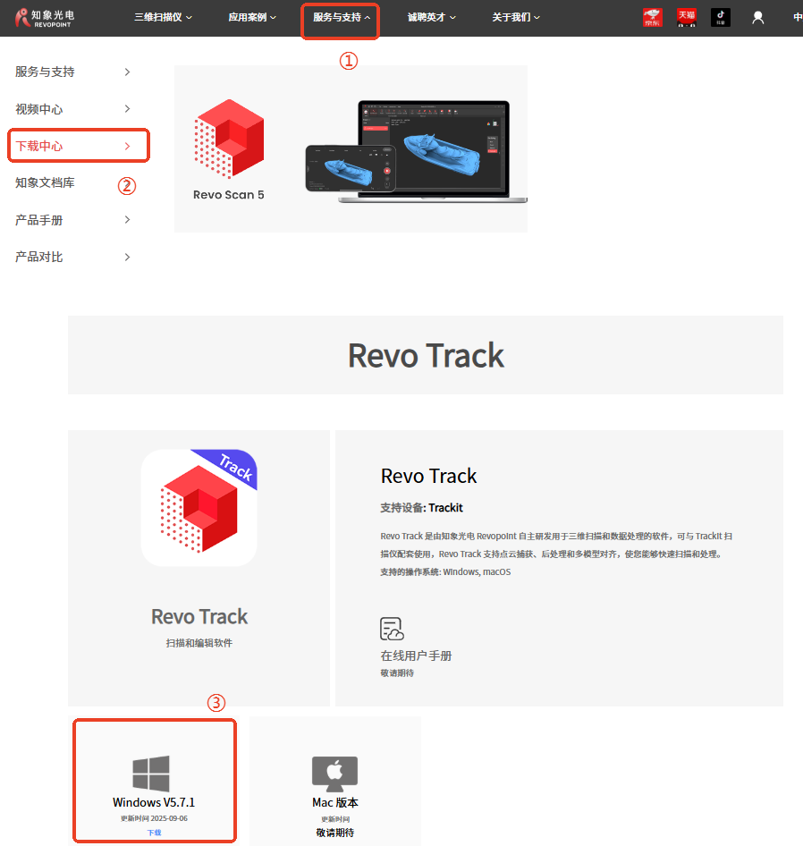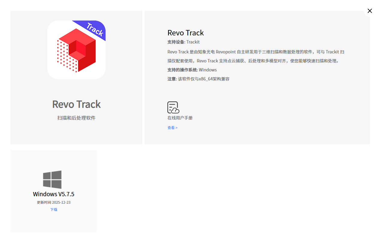 首次扫描前,请前往中文网站服务与支持— 下载 页面为您的Trackit下载“Revo Track”扫描软件。