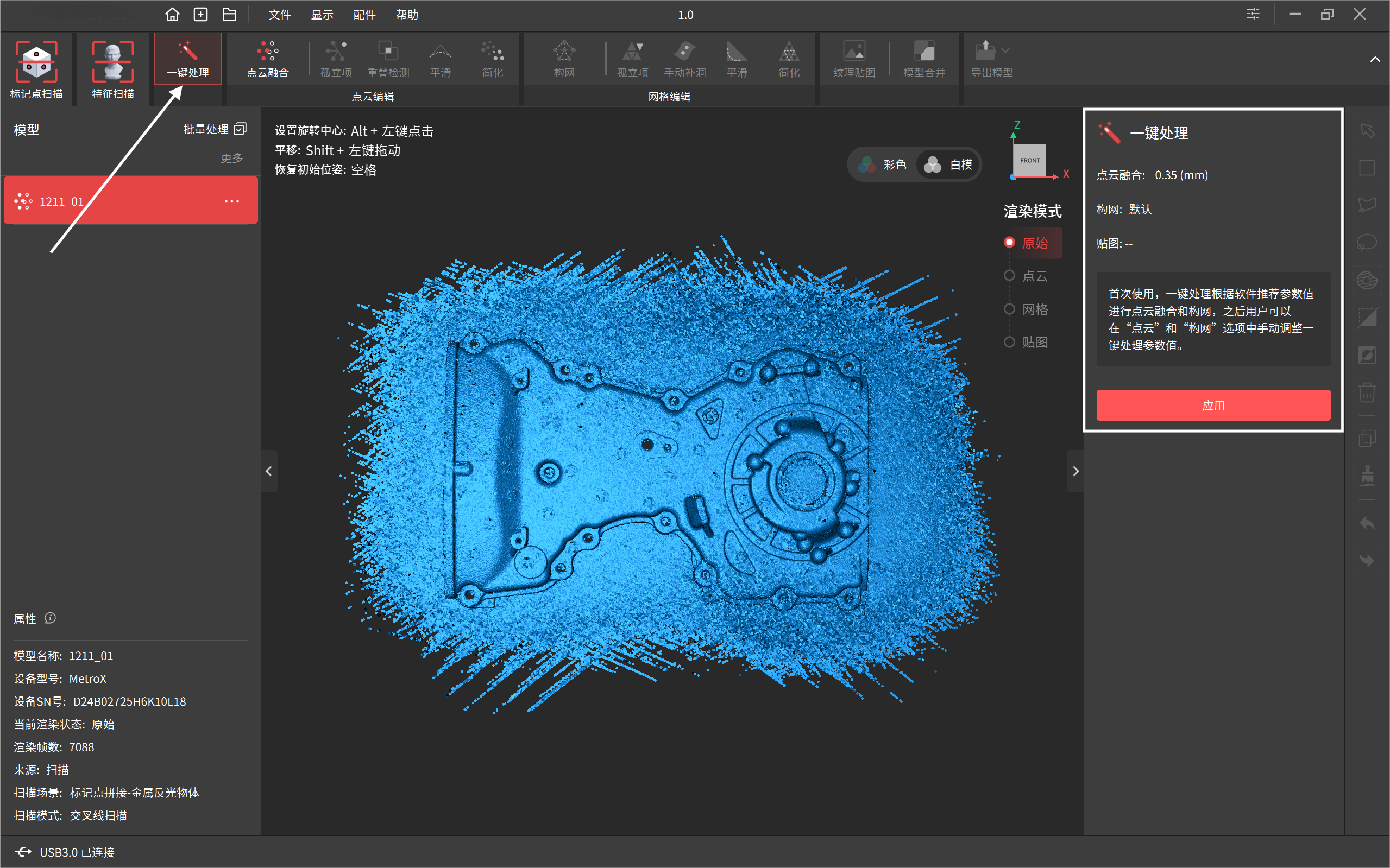 Revo Metro具有强大的一键处理功能,系统可自动根据最佳参数设置依次完成点云融合、构网和纹理贴图(如开启彩色扫描)。点击 “应用”按钮执行 “一键处理”功能。 点击“取消”撤销本次操作。