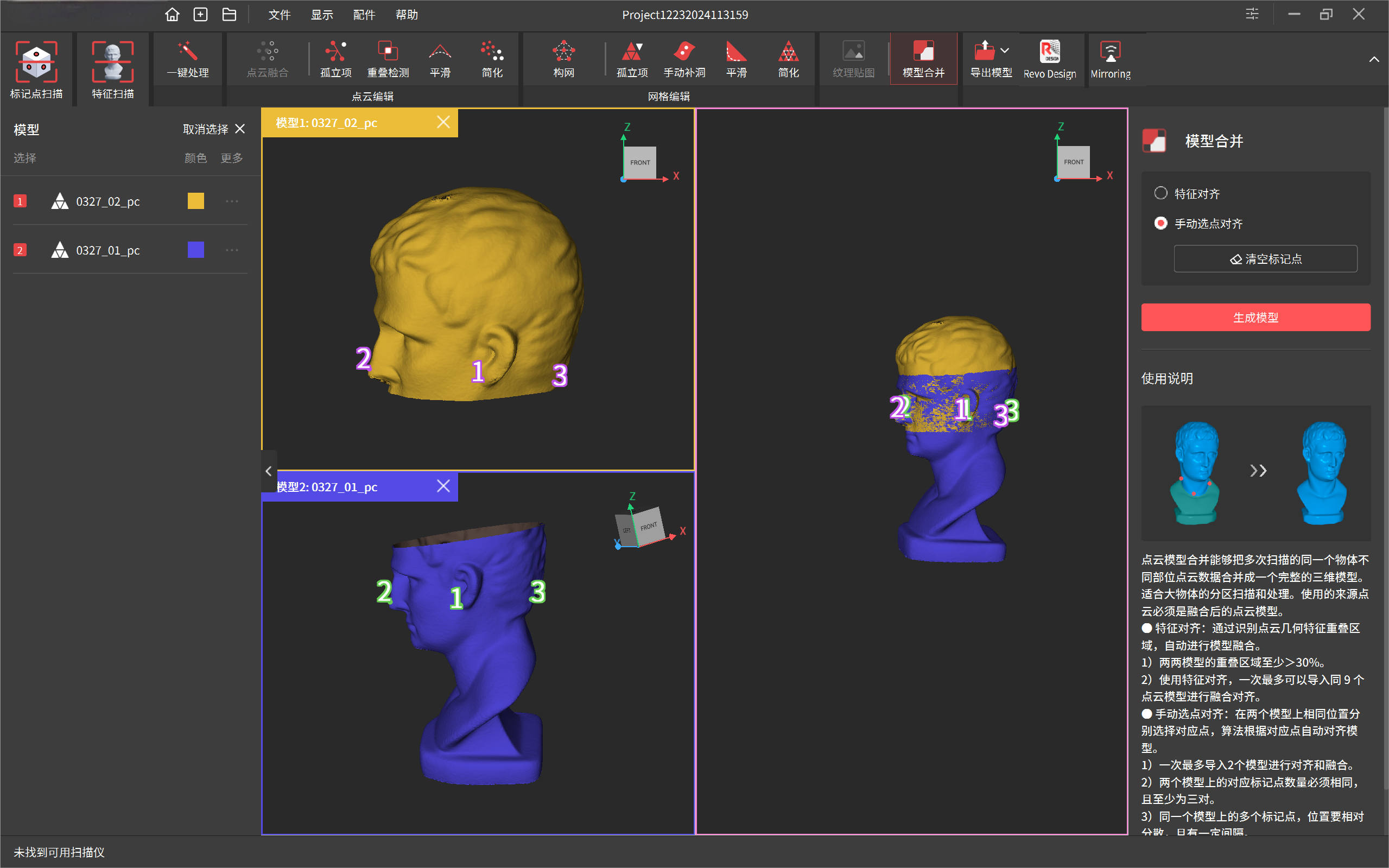 模型合并支持将多个独立的扫描模型进行合并,生成一个完整的三维模型。进行合并的模型需先经过点云融合。模型合并分特征对齐和手动选点对齐两种。