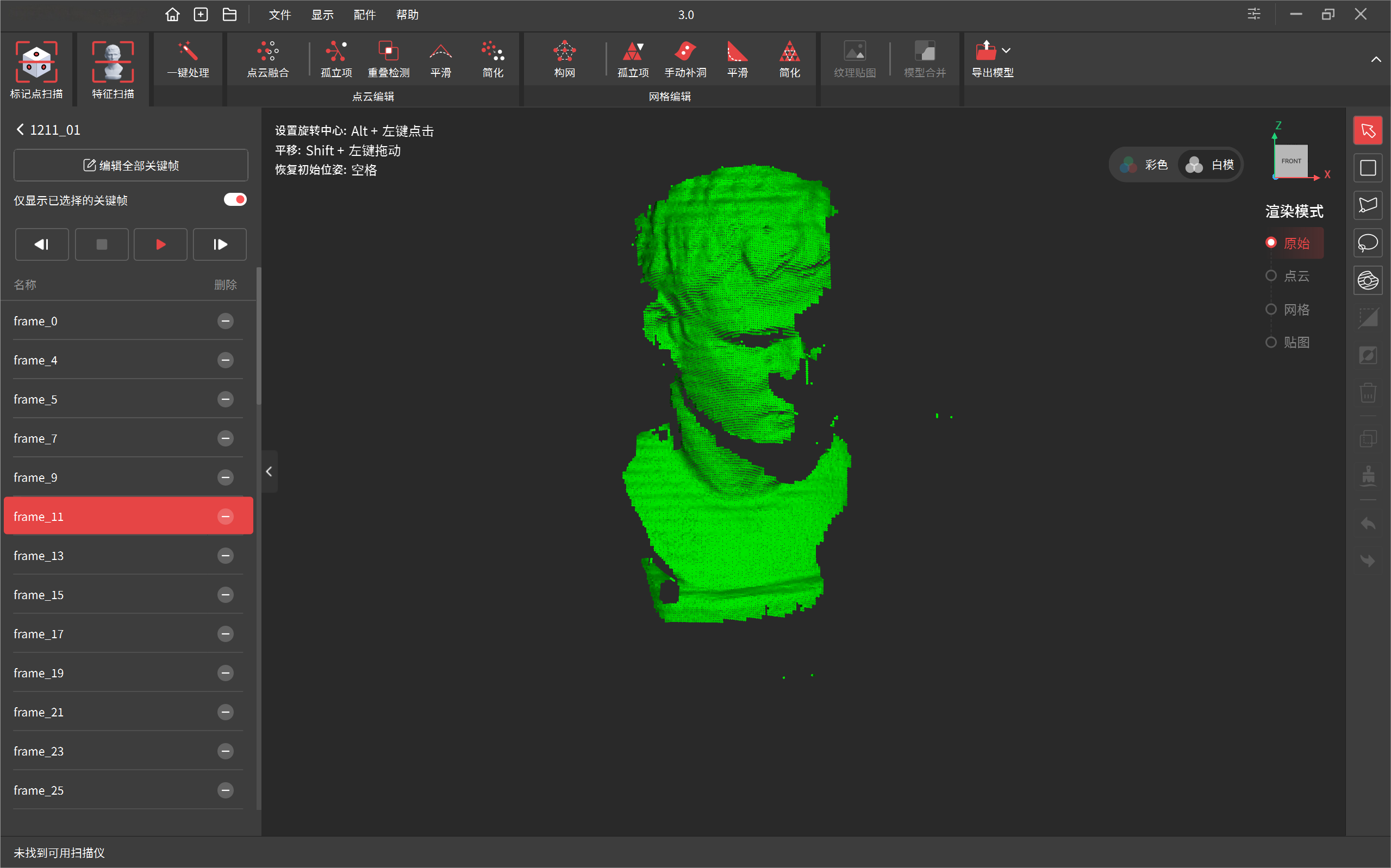 使用激光线模式(交叉线/平行多线/单线)进行扫描时,模型表面会随渲染帧数的增加逐渐由红色过渡至绿色,绿色表示模型质量较高。建议从多个角度扫描同一区域,直至模型表面完全显示为绿色状态。