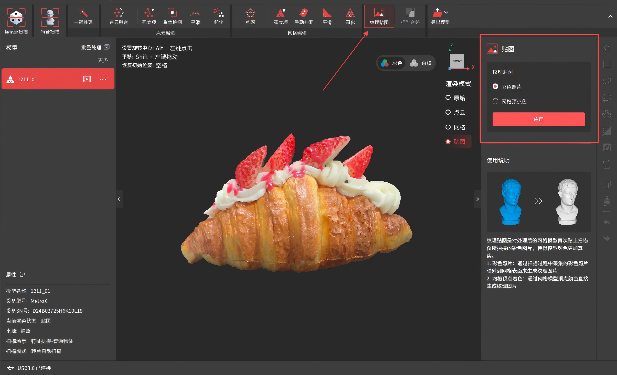 • 彩色照片:将扫描过程中RGB相机采集的彩色照片映射到网格表面来生成纹理图片。