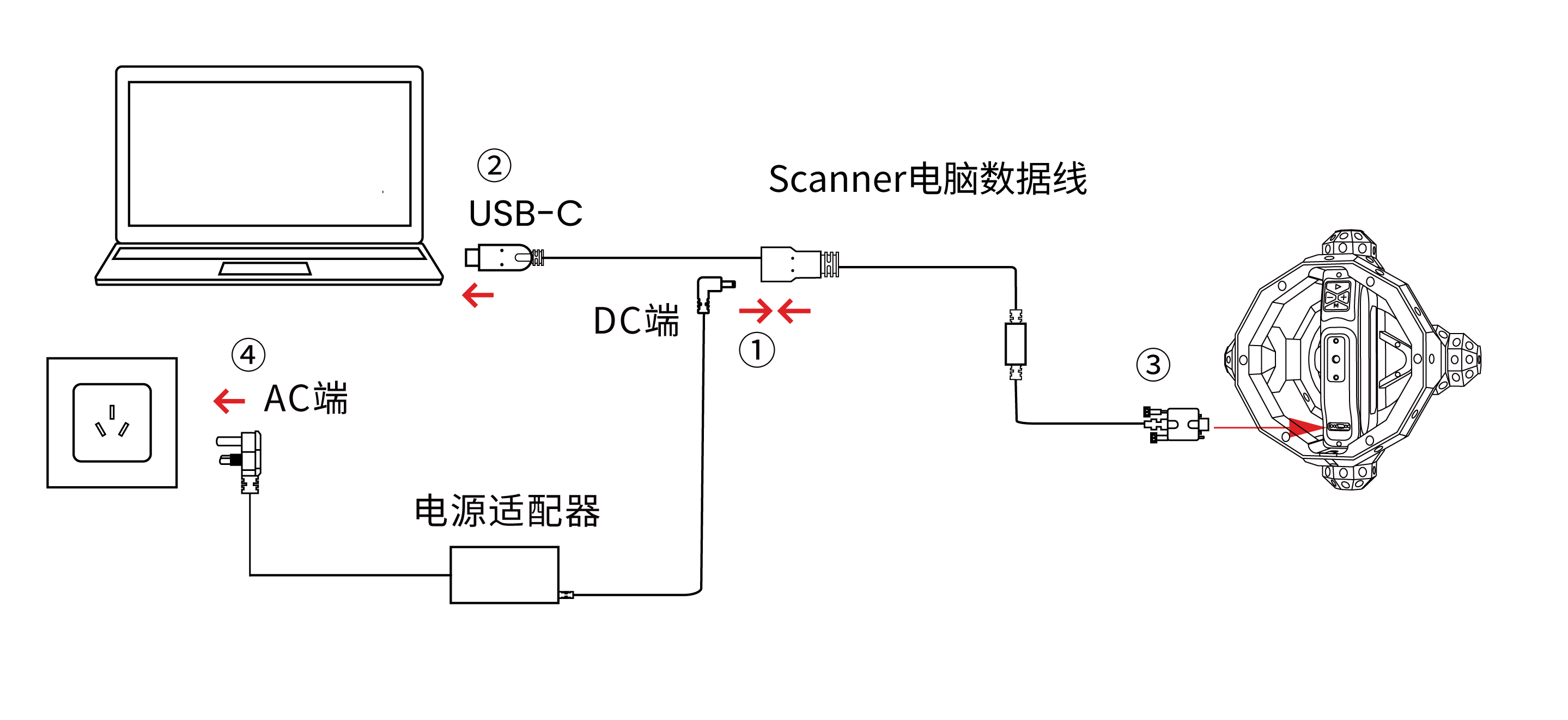 请按照图示步骤 ① - ④ 将Scanner连接至电脑和电源。该数据线为选配件,如有需要可前往 Revopoint 官方京东/淘宝/抖音商城购买。