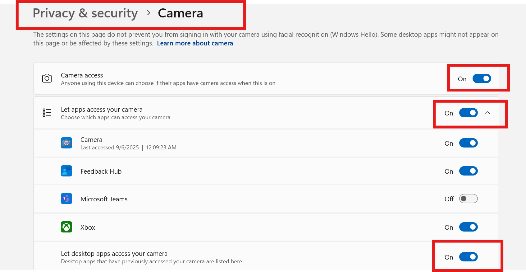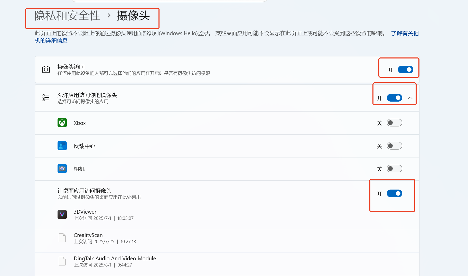 点击隐私和安全 > 摄像头,开启“允许应用访问摄像头”、“让桌面应用访问摄像头”。