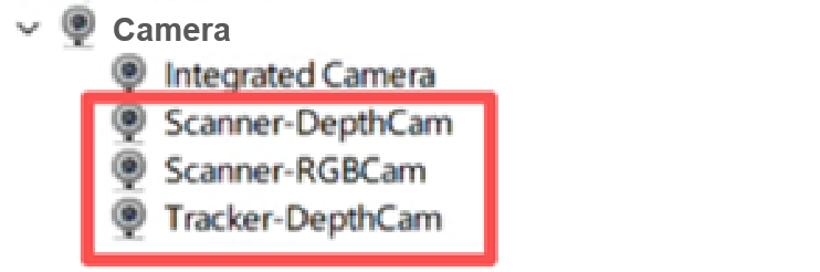 打开电脑上的 设备管理器 > 照相机 。检查照相机是否显示为Scanner-DepthCam, Scanner-RGBCam, Tracker-DepthCam。